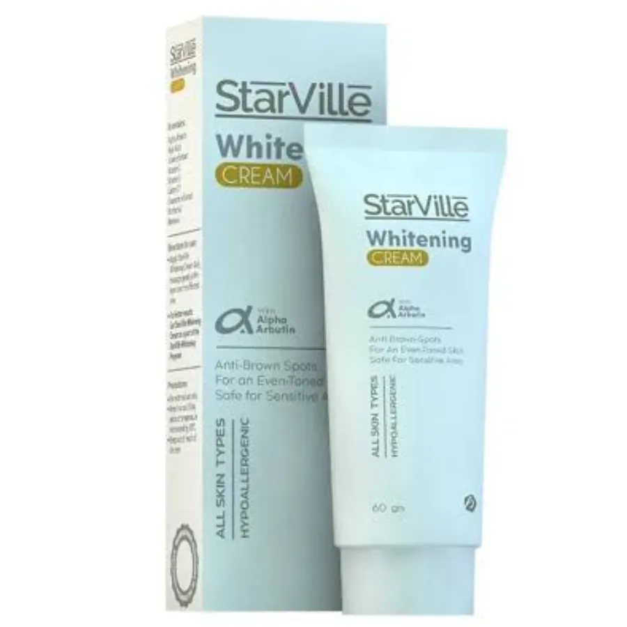 كريم تفتيح ستارفيل هو الحل المثالى للتخلص من جميع أنواع البقع سواء الناتجة عن حب الشباب أو التعرض للشمس أو زيادة إنتاج الميلانين. يحتوى على مكونات فعالة ( الألفا اربيوتين و خلاصة العرقسوس ) و التى تعمل على تفتيح البشرة و توحيد لون البشرة عن طريق تقليل تكوين الميلانين فى خلايا الجلد و هى مواد طبيعية لا تسبب ضرر للبشرة ترطيب البشرة و الحفاظ على نضارتها عن طريق فيتامين E, البانثينول و مستخلص البابونج. مناسب لجميع أنواع البشرة و امن على المناطق الحساسة.