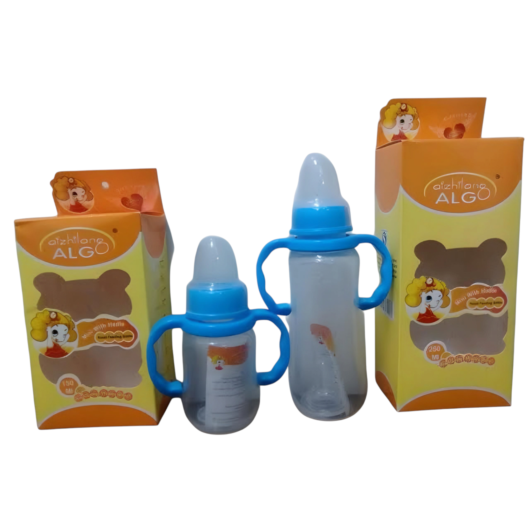 تتوفر منها ببرونة زجاجية وبلاستيكية وتأتي بيد تسهل للطفل الإمساك بالببرونة أو بدون يد.